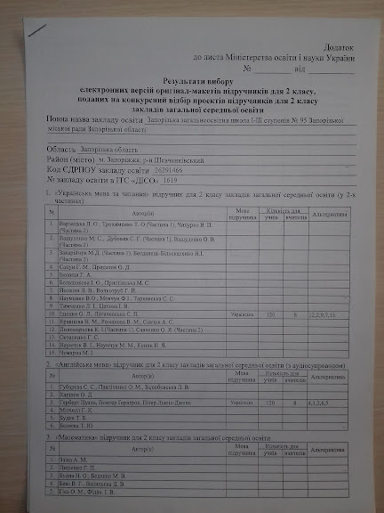 Згідно листа Департаменту освіти і науки облдержадміністрації від 12.02.2019 № 627/03.2-14 «Про вибір і замовлення підручників для 2 класу» на засіданні педагогічної ради школи, що відбулася 05.03.2019 був затверджений вибір наступних проектів підручників для учнів 2 класу